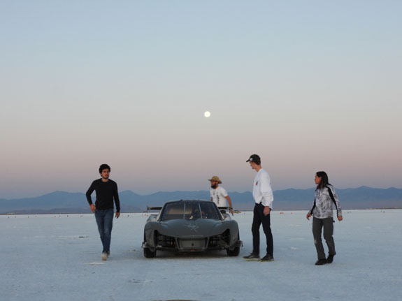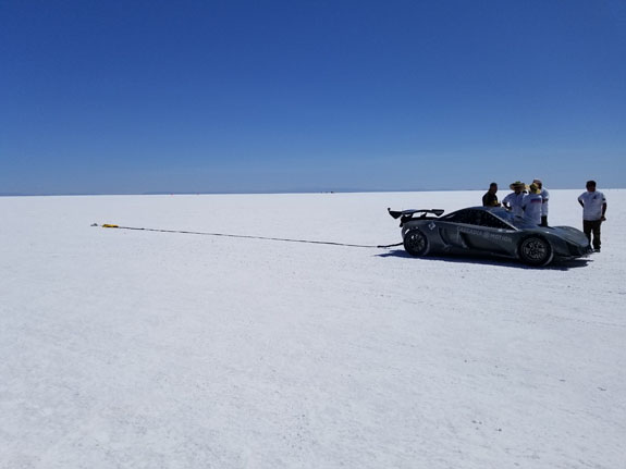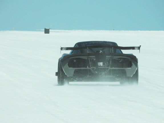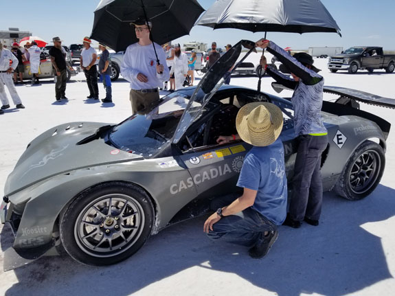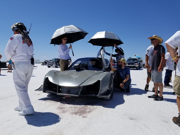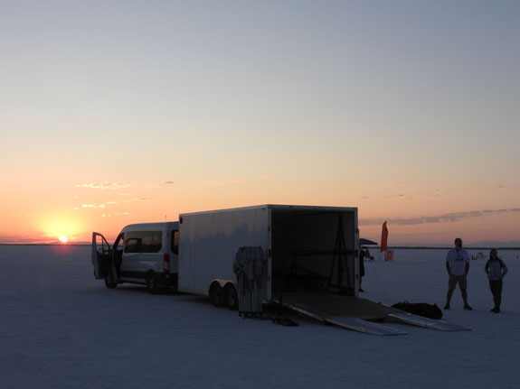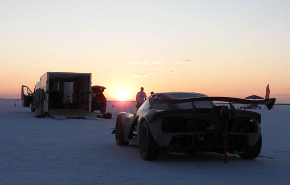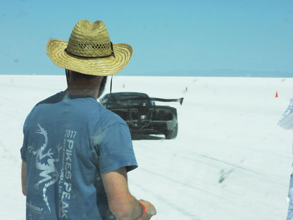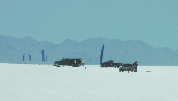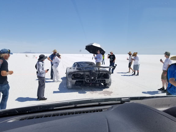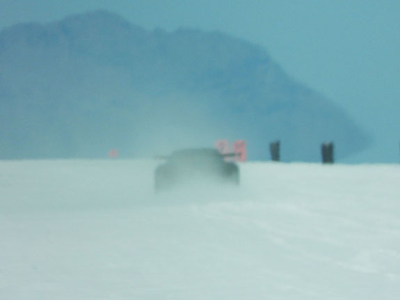 Even though Greg has been here before (on a bike, doing about 210 mph), the car is new so the chief tech inspector has to witness our first run which has to be under 175mph. We proceed to the short course, spend a fair bit of time in line and are eventually lined up. Then a few more minutes to wait for the inspector, and Greg does a first run at 159 mph. Pefect. We are signed off to go faster now, up to 175 mph.