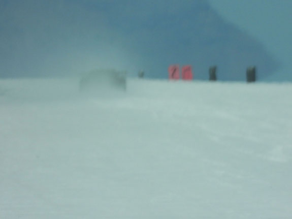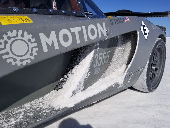 Even after just one 1-mile pass the car is already clogged with salt, including the radiators. Fortunately we are not relying on the radiators for these short runs and we know the pack can do what we need without cooling. All temps look normal and we only used 6% of the battery for the pass.