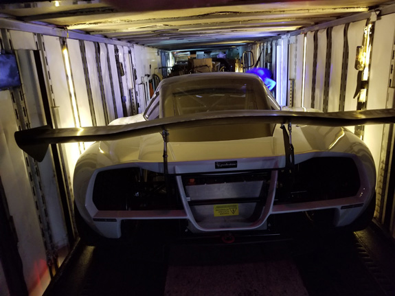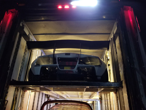 As is the norm, the car wasn't quite ready for pickup at 8pm so we had to push it out till 4am and made full use of the extra time. But load it we did. Even on a full size car hauler the width is a challenge.