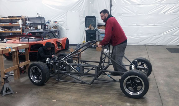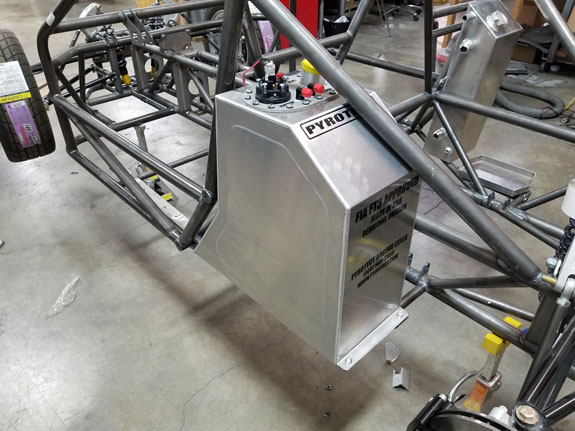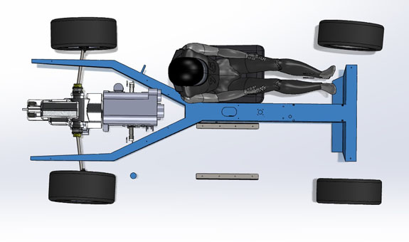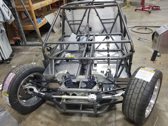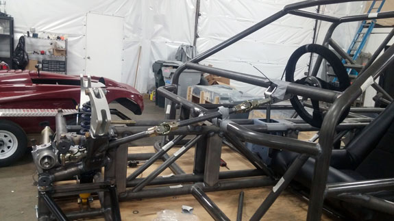 Installing the seat, shifter, steering, pedals, and suspension is next. It's a bit of a 3D puzzle, especially given the usual tight packaging, so we're tacking/taping some things in place first.