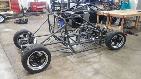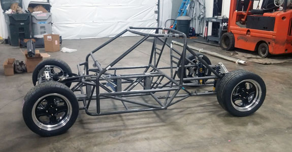 03/18/17 Now that the chassis is on wheels, the next step is to finish trimming and fitting the body to it, then finalize interior sheetmetal panels and how they'll interface with the body shell. In the process of lowering the body on the frame I just had to take a picture - it looked like some kind of crazy offroad machine :)