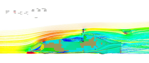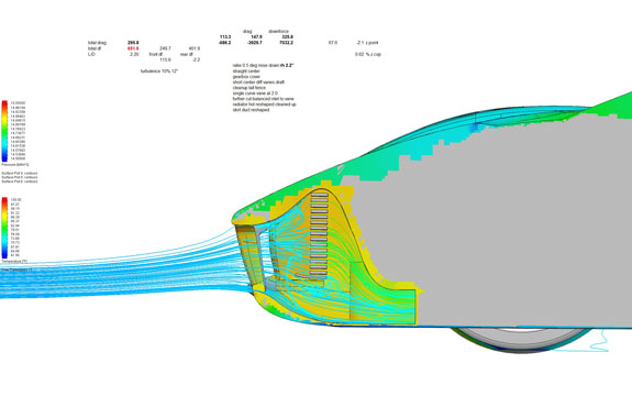 The physical testing serves to validate all the SolidWorks CFD I've been doing - literally hundreds of runs. Another way of validating is comparing simulations with other cars in the same setup, and same car in other setups. As a result of a discussion on a FB aerodynamics group, I downloaded the aero model for the Reynard Inverter and ran it on the same setup as a comparison. The Inverter is somewhat smaller than the D8 and runs at 35mm rideheight vs 55mm for the D8 in lowest setting.