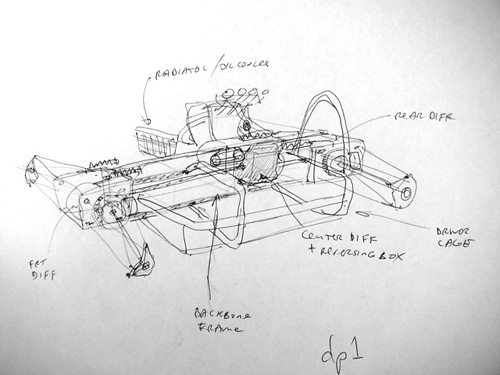 The reversing box weighs 18 lbs according to my scale, and the diffs 30 lbs each. A bit of a mystery is that the total shipping weight DHL had for the package is 49 lbs. I did a quick check of the scale and it seems reasonably accurate. Hmmm... Now that I see the diffs in person I'm not convinced that I want to use them. They were selected on a recommendation but perhaps I should continue looking. Perhaps I'll start out using them and then switch to something different later. These are definitely the lightest diffs I've seen so far by at least 20 lbs, but that doesn't mean I can't find something better. A good starting point I guess. 7/12/02 As I am always thinking about the project, was sitting around and going through some concept refinements in my head. A couple turned out worth sketching: