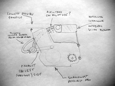This component selection by trial and error could get rather expensive. If I had a catalog of components with all pertinent data it would be so much easier. Well, if it were easy a lot more people would be doing this, I suppose. Onward. 8/01/02 Been thinking about the engine details a bit. Got in touch with a couple vendors of turbo kits, and made a sketch to send out to tell them what I'm looking to do: