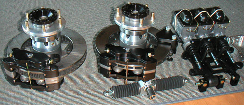 Still waiting for a lot of brake parts which are supposed to be here next week, and a lot of other drivetrain components which will arrive at some time in the future... Of course they are all paid for already. The lead times on some of the custom stuff can be pretty long. I'm getting the feeling that the first pass at this car building stuff is going to be less than ideal if it is to get done at all. Just got to accept some compromises to make a prototype and refine from there. Which also means this is going to be a lengthy and expensive endeavour (and is well on the way in both regards already at 6 months and rapidly closing in on $20K before any really tough work has even began). But I knew that going in. 01/17/03 The brake parts finally arrived. Little by little things are coming together.