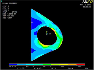 Each complete assembly, with diff, bearings, flanges, rotor and caliper (2 in the back) weighs 27 lbs. This is 3 lbs more than my spreadsheet shows, most likely because the 14 lbs for diff weight that I had probably didn't include some parts. Each diff assembly complete is 17 lbs. Overall the weight is pretty good - considering that the Cosworth shaft-drive diffs I was originally thinking of using weigh 30 lbs, WITHOUT flanges or brakes - and they would have required double the number of brake components! I had TPE do a stress analysis on the brake rotor mounting setup. The results showed some deformation at a little over twice the expected maximum load, but I hope it will hold up under any use that I'm likely to subject it to in the first few months..