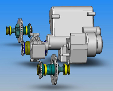 10/30/02Well, pretty much all of the Hayabusa parts have been sold on e-bay. Turned out OK, as when all is said and done the brand-new motor with all the electronics, dash, etc., ended up costing me around $4200. Learned a few things in the process, and I think this would actually be a feasible way to do low volume production - just buy the bikes and part them out. In the meantime, the driveline design has been evolving some more. Finally received the Quaife center diff, and found a good source for front and rear diffs that allow the chain or belt to run on the side of the frame. The same company (TRE in Texas) will hopefully help me with some component design work and fabrication. About 20 years ago in college I had an idea of an AWD system using Torsen diffs with braking applied to the diff, and the brake torque actually being sent to the wheel with the most traction automatically. Lo and behold, TRE is doing exactly that with their differentials, although up to now they've only done rear wheel drive - but apparently the concept works really well. So my plan is to have just two diff-mounted brake rotors, one front and one rear. Light, efficient and elegant.