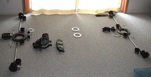 I'm planning to use Tsubaki Sigma 530 chain, commonly used on drag bikes. It has 10,600 lbs tensile strength and very good wear characteristics (it is a sealed O-ring type design). Each of the two chains is roughly 8 lbs and costs around $150. Tensioning will be via slack-side idlers, I think. As I get into the details of suspension pickups and diff mounts I might consider movable diffs instead, but it would require accommodating positioning the calipers accordingly since the rotors are diff-mounted. We'll see. There is no shortage of choices and options... 04/17/03 Finally received many of the parts that I had ordered back in November (took a couple of days over 6 months). Laid out pretty much to scale in the spare bedroom they for the first time give me an idea of the scale of the car - very short and wide (and low). Basically a 4/3rds scale kart.