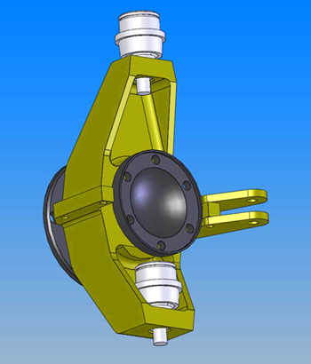 The steering 'arm' bracket can bolt on to either side, making this a universal part and allowing easy changes in steering geometry. According to my CAD system the upright should weigh 1.56 pounds if done in 7075 alloy. Steering tie-rods will use a 3/8" rod end for now, although the bracket setup allows changing to ATV tie-rod ends later. With a few more parts in CAD the design is looking kinda like this:
