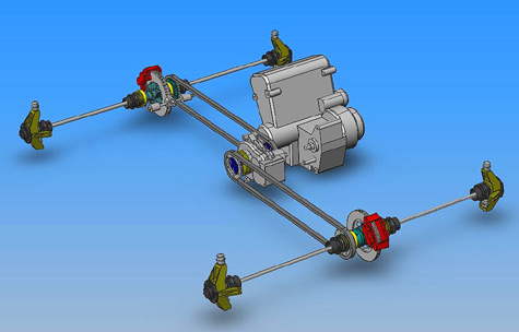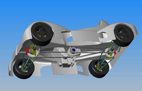 There are quite a few aspects of the suspension design that are very experimental. Most of them are enabled by using AWD, inboard brakes and a backbone chassis. First, this allows very long control arms, as previously mentioned, and a near-vertical kingpin angle with less than 0.5" scrub radius. The purpose of this is to eliminate weird camber changes with steering and reduce torque forces since front wheels are also driven and power is significant for the weight. With +/- 2" of suspension travel this translates to less than +/- 5 degrees change in control arm (and halfshaft) angle. Because of that, I am able to use non-parallel, equal length upper and lower arms so all eight of them are identical - this should help with fabrication and spares. I can increase negative camber (and amount of camber gain with roll) by moving the inboard pickups of the upper control arms lower. There is no anti-dive or anti-squat in the geometry because the cross-corner antiroll bars should minimize both. Another goal of the suspension design is the raised position of the lower control arms, which combined with their length should create a lot of room for underbody tunnels. This should in turn generate plenty of downforce even at fairly tall (3-4") ride heights. So in theory it all works very nicely, and all the numbers come out very clean on the CAD system. How well it works in real life remains to be seen :)