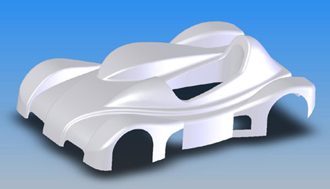 Ha. It seems like it's going to work quite well. The general idea is having a main 'body' as a thin airfoil, with 'bumps' for fenders, cockpit and engine. Overall I am trying to utilize the area rule of airplane aerodynamics. There is much argument over whether this supersonic concept applies to low-speed stuff, but there is evidence that it does. And it makes intuitive sense, too. The idea being that cross-sectional area of a body should change smoothly along its span. Any time you have an abrupt cross-section change, the air has to go somewhere and having no room to move aside it is being forced to abruptly accelerate (only to be decelrated later). This causes much drag and turbulence. The area rule is that if you have a bump on the body you should have an indentation next to it, and vice versa, so the air can move laterally and not get abused. The top view above speaks for itself. The main 'body', excluding bumps for fenders, cockpit and engine, is only 19" tall... :) The primary goal of the design is to move the air sideways and not vertically. Vertical movement generates lift which I want to aviod. Afterall, this is a 700 lb car with a design top speed of 170 mph (gearing limited). Additionally, there are some underbody tricks that I am contemplating (also shown above). I am trying to create as much tunnel volume as practical while keeping slopes gentle to prevent flow separation. Front tunnels vent to the side, underneath driver's raised feet. In the back, a low-mounted wing uses the gap between itself and the body to improve efficiency and assist the rear diffuser function. All this is accomplished with absolute minimum overhangs, placing front and rear low-pressure areas pretty much within the wheelbase. This greatly reduces pitch sensitivity and improves overall balance. Or so the theory says.... I already have an offer from someone to do wind-tunnel testing on a scale model next year. Hope he's serious and can't wait to take him up on that :) 04/24/03 It's been a long day but I did it. The initial CAD of the bodywork is done. Of course there will be much tweaking once more parts are finalized, and there's still a chance that I'll want to do it differently - but for now it's there. Also it looks like the whole shell should be doable as one single piece which simplifies things quite a bit.