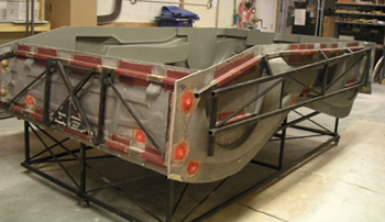 The following day finally got to meet Kurt, the builder of Kimini, whom I'd been corresponding with for a couple of years over the Internet. It's a real pleasure to sit down and talk with like-minded people who not only understand but share the madness :) On a whole different but somewhat related subject, I stopped by the Body Worlds exhibit at the California Science Center in LA. It is a controversial and somewhat disturbing presentation of plasticised human cadavers, opened up in a great number of ways so that the various inner structures of the body can be seen up-close. The reason I mention it here is that I came away from it with a new appreciation of how well-engineered we humans are. The packaging job is amazing, as is the functionality of the various components. Da Vinci, as I recall reading, was a fan of dissecting corpses and I can clearly see how he may have been inspired by what he saw. The exhibit runs through January 23 and for anyone in LA area it might be a worthwhile thing to check out. Yes, at first it's a bit of a shock but once past that I found it fascinating in a rather profound way. It is not morbid but ultimately enlightening. Not an experience that would be easily forgotten. 12/23/04 Dropped by the Composites shop to check on the progress of the tooling. Things are moving, although not as quickly as hoped for. No parts for me this year but hopefully mid-January I'll have bodywork and a floor. The body molds are still on the plug but a good deal of the support framing has been completed. The red-painted spots are where the alignment bushings are to make sure the molds go together precisely every time.