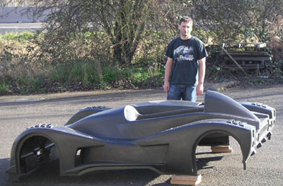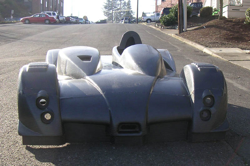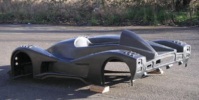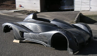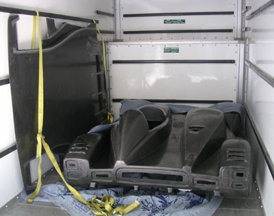 NOTE: With the receipt of the body I now consider the design portion complete and so this is the last update for this section of the site. The next phase is development, which has its own section. 02/08/05 FINALLY. The big day. In the morning, went with my friend Satya to pick up the U-Haul truck and then on to Scappoose to get the bodywork. I'm going to be subleasing an 800 sqare foot industrial space from Satya where the construction will take place. So yes, the dp1 gets its own facility! But at the moment I had to deal with getting things moved. First issue was with the truck - the floor is not flat, it has bumps over the rear wheels. This will cause difficulties with the plug. But I just said to myself 'hey, we're engineers, we'll figure something out'... And so after a half hour of piloting the 26' U-Haul land barge to Scappoose I finally see the dp1 bodywork in the flesh. The whole thing weighs 41.6 lbs (it will be even less after trimming) and is surprisingly rigid. Cool! The surface has a lot of small, mostly cosmetic problems. Supposedly this is normal. They did fix the molds so while there is a very visible parting line there is no actual step in the surface there, so once it's sanded and painted the line won't be visible. So this will take a lot of finishing work. Eventually I do intend to have it painted because cosmetically the carbon is not going to be all that good. It's too large and complex a piece for that. And I've seen what happens to carbon when it gets rock chipped - not pretty. Anyway, loading the body and the floor into the truck was easy..