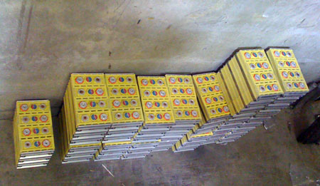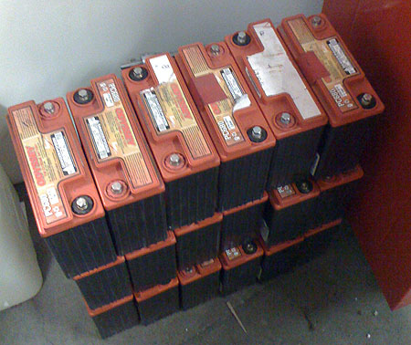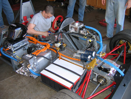 The original pack consisted of 24 hand-me-down Odyssey lead-acid batteries. Combined they weighed 400 lbs, provided around 3KWh at 288V (in their prime at least) and cost just short of $3K. The new pack is 110 of 40Ah LiFePO4 cells. The weight is almost exactly the same, voltage is around 360V, physical space is about double, storage capacity is 4.5X and cost is roughly double that of the old pack as well. Not bad, all in all. The challenge now is finding room for all of it but I think I have it figured out. Tristan will be making the appropriate bits and pieces next week. Of course tradeoffs remain. These cells are rated for 3C continuous current so that's about 120A, which is less than half of what the motor needs to produce max power. There are several choices. One is to go with same number of larger cells - but cost, wieght and size grow beyond practical for this particular application. Or we could go with smaller number of larger cells and while that addresses size and cost, the voltage now falls short and we're back to less than full power. Another possibility is to use fancier cells which can tolerate greater current. There are some cylindrical cells that will do double continuous current but they cost twice as much, all else being rougly equal. Or we could use super cells that are both smaller and more powerful but the cost is now 6X. Great for F1 KERS (on which the RMS controller is directly based) but not so good here. So we are left with the final alternative - manage the battery according to situation. We'll have a dial that goes 1-11, with 1 being the most conservative half-power setting, 10 being very aggressive and possibly cell-life-shortening but still sane and 11... well, should be obvious. We won't use that one much but it'll be there. Now of course not much is known about the condition of the cells we got and having heard stories of DOA batteries I remain cautious until we've done some testing. But it's got to be better than long-dead lead acids - no mystery about the condition of those. So I don't know if we'll have a fast car yet but I do know we'll have a more usable car than before and that will enable us to do some good things. Stay tuned. 06/22/10 We have less than a week to go before our next track event on the 28th and we are frantically working to get the dp4 and dp1/e ready. The dp4 is completely apart and the frame is still at the powdercoaters - it was supposed to be back today but they've encountered some kind of equipment problem. Things are running behind on the dp1/e also, but at least we've got the basic framework for the battery pack welded up and the pack test-fitted (there are 5 additional batteries that go behind the right front wheel). This is roughly 14KWh or just under half a gallon of gas :)
