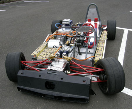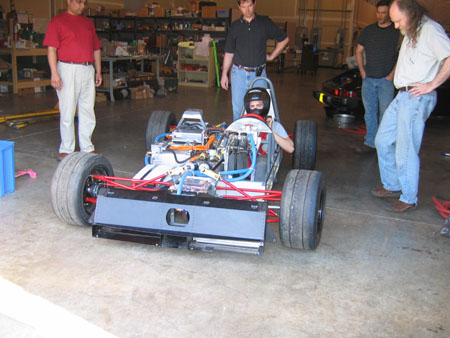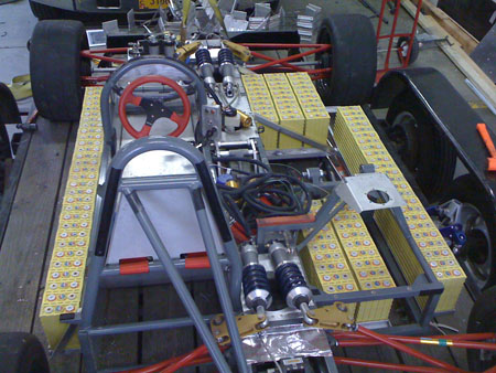 Still needs a lot of reiforcement and various systems fitted. The BMS won't be ready for Monday but we can do some stuff without it. Challenges abound but we're making progress. 07/02/10 After a couple delays and lots of work both here and at RMS it looks like we'll make it to Laguna afterall. RMS just finished installing the motor, controller, plumbing, wiring and a few other bits, as well as putting the initial charge in the pack. Kyle said "Well it's properly fast now. The old batteries were holding it back quite a bit. It's ready for Monday morning". Monday is when we go to test at Pats Acres kart track. More then.