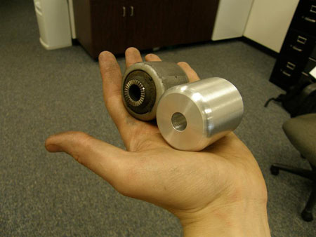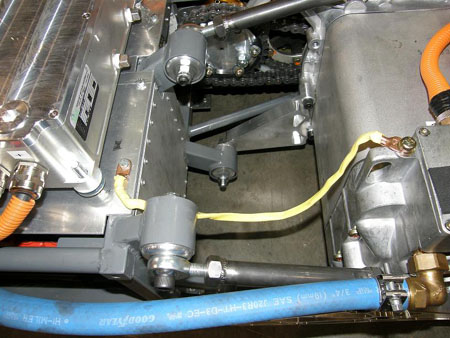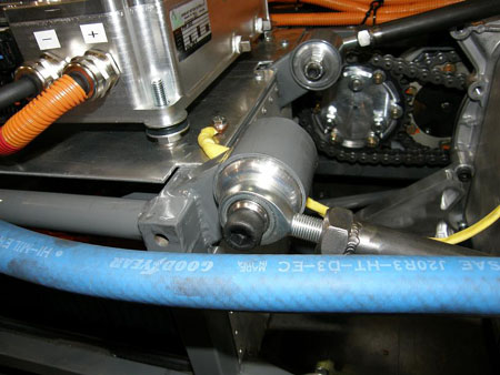 07/31/09 So far the controller has been set at a 40% torque limit (100 NM) and 150A. Even with that the car is entertaining, as this onboard video of running around a parking lot shows (no it's not me driving :). So now it's time to up the ante. The torque is up to 160 NM and current is up to 300A. This has necessitated replacing rubber motor mounts with solid aluminum ones, to avoid throwing the primary chain off.