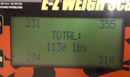 Apparently the car is now too fast for the parking lot (this coming from the guy who drove it in the video) so we'll have to try and set up some testing at Pat's Acres. Battery pack is really marginal for this of course so we only expect a handful of laps but it's better than nothing and will give us some valuable data. Anyone interested in having their advanced battery tested? Let me know. 08/02/09 A few people have asked about the weight of the car so last week I put it on the scales.