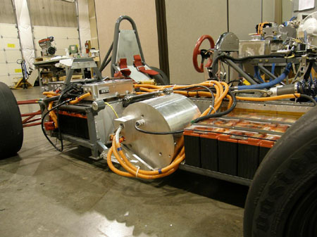 This is with 24 Odyssey PC680 batteries. With me in the driver's seat the weight balance is not bad, about 54% right / 46% left. A lighter battery pack would even things out more. This one is 380 lbs of lead. When the current and torque limits are cranked up to full capacity of the controller the car will have about 130 hp so it should be pretty fun. 10/30/09 A week ago we tested the dp1/e at the kart track, along with the dp4. So far this car has been primarily a development test bed for the 100KW RMS controller. It has served the purpose well allowing the fine-tuning of drivability and overall control algorithms. The controller determines the feel of the vehicle because it is the link between the driver and the power that is delivered to the wheels. There is a lot more to these algorithms than one might think and the difference can be between a car that's jerky, unresponsive and annoying to drive and one that responds linearly, predictably and is generally fun. All that development has been largely completed, this test was to try a couple max-output laps. Of course our battery pack is pretty much dead (now below 20% original capacity) so we knew we had literally a lap or two before we'd be out of juice. Below are the speed and battery voltage plots from the initial two laps. The second lap looks like it's about 47 sec which is a bit slower but roughly comparable to the dp4 (have to take into account the number of laps and how hard each car was pushed which is not very). The acceleration onto the front straight (starting at 80 sec mark) is particularly telling of how bad the battery really is, dropping from 315V unloaded to 230V under load. The car can accelerate a good deal better than this but that's all the battery would let us have. The two laps consumed approximately 0.6KWh of energy at which point the pack was 2/3 done - notice how towards the end the voltage drops to 190V under load. When new it should be 2.5-4.5KWh depending on how you measure it (rate of discharge is a very big factor in capacity). So on a brand-new pack of this type we could hope for 6-7 good laps instead of what's really 1-1.5 laps right now (which correlates with other EV testing I've done here). Keep in mind that this is on a 1/2 mile kart track with an average speed of about 30 mph so it puts the real-world challenge of electric race cars in perspective. As another data point, our current battery was used for about 1,200 miles of street driving before being installed in the dp1/e so that is an indication of the kind of life one could expect. The cost of the battery is around $2K so it works out to roughly $2/mile. We are now in discussions about testing an advanced Lithium-based battery of about 10KWh at 300V. That will make it a much more useful (and much faster) car and allow some higher-speed testing. In the meantime, there is a new synchronous DC (brushless) motor that RMS will be testing in the car. It is a good deal lighter than the Ford/Siemens unit and has higher torque so this should be fun. This is definitely a much more interesting life for the chassis than hanging it on a wall like I initially intended :) 11/19/09 The work on dp1/e continues. RMS now have a permanent magnet motor mounted and running. It puts out 330 NM (about 245 lb-ft) which is more than double that of the Ford AC unit.