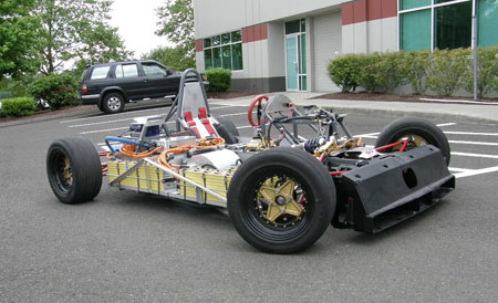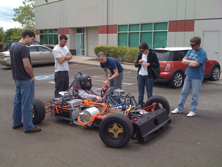 Size and weight are comparable to the Ford (the prototype motor enclosure is a good deal larger than it needs to be). We should have some video of it driving around shortly. Still stuck with the dead battery pack for now, hopefully that will change soon. 05/27/10 So far the dp1/e has served as the development and demo car for the RMS controller and a testbed for a couple different motors. Now we're contemplating a somewhat more public role for it - a trip to Laguna Seca for the Refuel Time Trial in July. It's not fully confirmed yet but it's the goal. We've needed to put a real battery in the car for quite some time, so now we might actually get around to doing it. Karl drove it briefly around the RMS parking lot and declared that he would have a blast at Laguna. I think I would too :) So we'll work on making that happen.