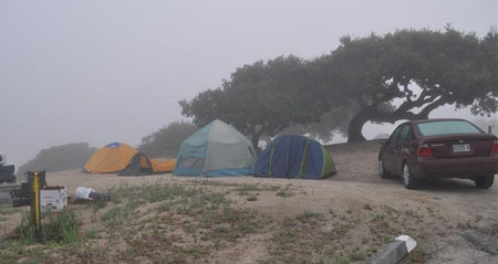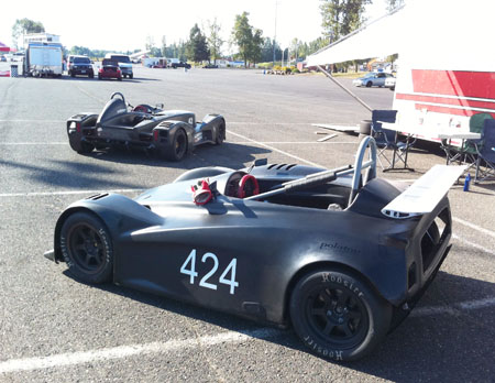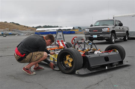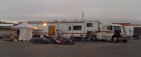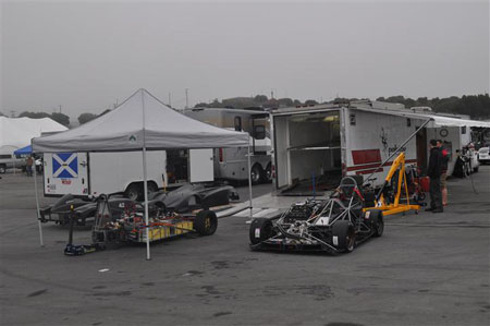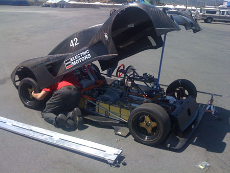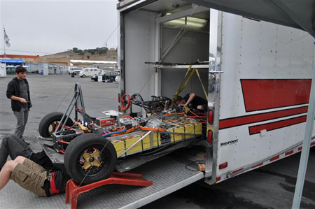 07/08/10 In the previous post I had mentioned that the bodywork would get installed Wednesday. It is now Thursday, 6 am, and we're loading the dp1/e into the trailer on the way to Laguna. The floor is suspended from the trailer ceiling but we do plop the bodywork on top of the chassis because we have no room for it anywhere else. Not quite 'installed' but it's 'on'. For the last few days Kyle at RMS has been working long hours designing and machining the mounts for the new motor enclosure that arrived from Remy two days ago. At first, we considered the enclosure swap a nice-to-have option. That was before realizing that the floor won't fit with the old enclosure in place. The bodywork attaches to the floor. And hoses/cables dangle perilously low without it. So about 24 hours ago the swap became a must-do. Checking in last night Kyle put the chances of successful completion at 50%. This morning he is confident that having two days to work on the car at the track he'll get it done. The BMS/charger system that we have been working on is not ready although yesterday mid-day Ken (the EE I"m working with on the system) took delivery of 100 PCBs and populated them enough that they can serve as visual charge indicators for individual cells. He met us at our shop at 5:30 am to hand us the boards before we took off. That still leaves us relying on the borrowed bulk charger which requires 220V input and might be broken anyway but we think not. Also the DC/DC converter that runs the cooling pumps has quit so we're just going to use an Odyssey 12V battery. Should be good enough for the time trial. We load up and drive 14 hours to California. On arrival, all is not well. There has been damage to the suspension in transit and we'll have to repair and reinforce the lower arms. We're also going to need the two spare ones that are currently employed as PC racing simulator steering wheel support. Back at the house in Portland. But the race is not until Sunday so all is not lost. 07/09/10 It's a cold and foggy morning.