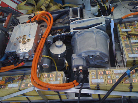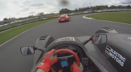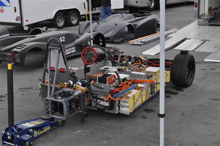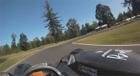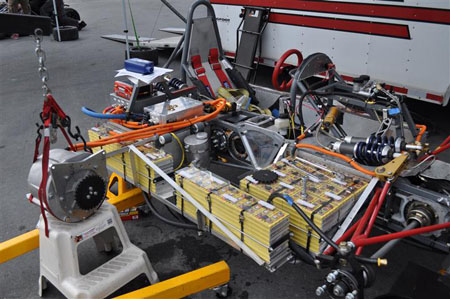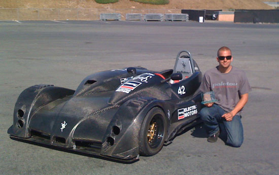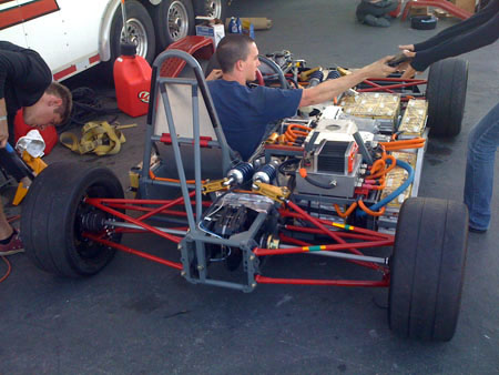 Of course the real value in this trip is everything we've learned. And one of the things we've learned is that we can overcome quite a lot when we don't give up. There is much work ahead of course but this is a very encouraging start. It'll be interesting to see what we'll be able to do with some development and testing. 08/10/10 Testing and development continue on the dp1/e although I haven't been posting about the specific events. They've gotten pretty routine now. I did make a video of a session at Pat's Acres. We still need to do more (and better instrumented) testing but so far the results are encouraging. At a recent endurance test the car went for over 1.5 hours on a charge, with top speed of 65mph and average of 35mph, covering about 45 miles at a pretty good pace (see video above). We stopped when the Odyssey battery that's running the cooling pumps died. The main pack was still going strong. As I've mentioned earlier, even though we're doing the testing on a race car the components and technologies we're developing are mostly intended for commuters, city cars and the like. So the car's performance should be taken in that context. When we do finally have products to offer for sale based on all of this you can expect some pretty fun little city runabouts :) But all that is many months away still. 09/03/2010 Finally got a chance to do some high speed testing at PIR. Since we don't yet have a portable way of recharging the car it meant only doing one session but even that is quite valuable data. So after all day running the dp4 late in the afternoon I finally jumped into the dp1/e for a 15-minute outing. Here's a video from that run. Best lap was 1:41 driving pretty conservatively and average was 1:42. Looking at the data and comparing it with the dp4 it's clear that most of the difference is in the top speed which is around 90 mph for this car in current configuration. Having only one gear is a drawback and some of our future development is aimed at addressing this. Of course the fact that we can't draw much power from the batteries is a hindrance also, I'm guessing we are limited to about 55-60 hp right now.