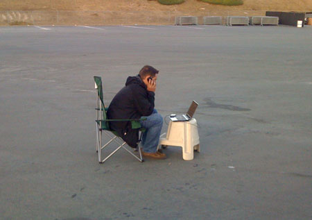 The wheels go on, the car is lowered onto the ground and all seems well. Kyle drives it a few loops of the paddock and seems pleased. I take a turn and all is well except the power is definitely lacking. We discuss this and it is possible that the new motor has something wrong with it (being a used unit from an electric boat, all we could come up with on short notice). Kyle offers to swap the old one into the new housing but it's getting late. The other possibility is that the controller is not configured properly. To test this we need to talk to it. I try the USB-serial cable on my laptop and it doesn't work. We hook up a wireless Internet connection using Kyle's phone and I go looking for a driver. Someone puts a chair under me while I do that - I didn't even notice I was kneeling in front of a laptop in the middle of a parking lot. Yes, the trailer is only 20 feet away but I'm oblivious to such things when on a mission.