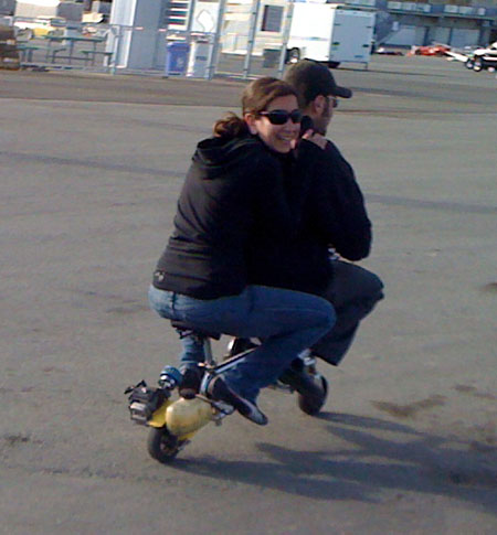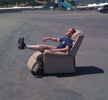 Throughout the day steady progress is made. Occasionally we take breaks to unwind. Jeremy has brought a bunch of his toys, from motorized skateboards and microbikes to a high-performance RC electric helicopter with which he puts on mind-boggling airshows every now and then. Davide has a natural talent for the little scooters and is drifting them supermotard-style around the lot. He is promptly nicknamed 'Scooterossi' (the name is properly pronounced in the worst fake Italian accent). Additional entertainment is provided when we spot a remotely-controlled motorized recliner chair scooting around the paddock. Kyle can't resist getting a ride.