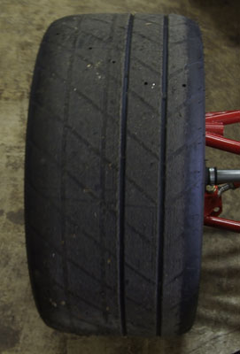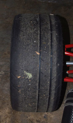 10/11/06 Doing some more work in preparation for the big track. First, just cleaning up the brake dust and checking for any undue wear, etc. Interestingly the rear tires got more of a workout than the fronts, despite dead-even weight distribution and AWD. The front tire is on the left, the same-side rear is on the right.