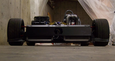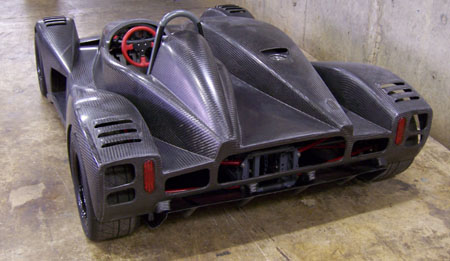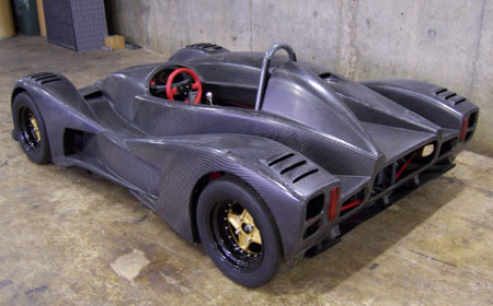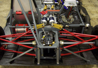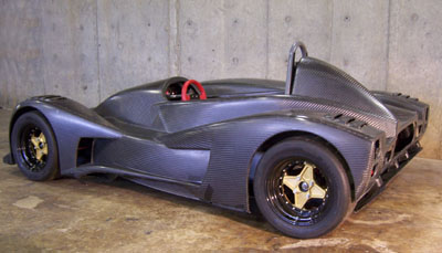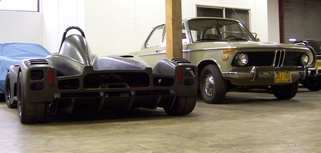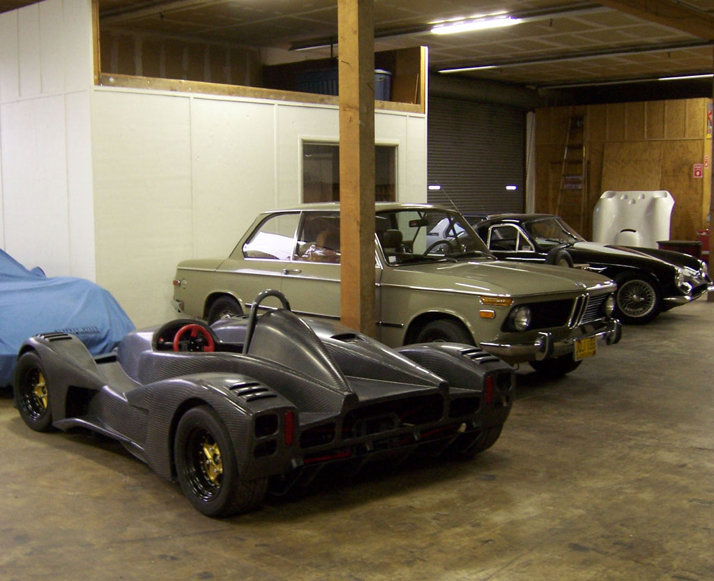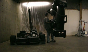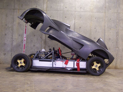 That is until you park it next to a normal car and realize just how crazy this little machine is (each picture below is clickable for larger version). Keep in mind, too, that the prototype only has 180hp, or about twice what the 2002's got (at less than half the weight). Of course the real thing will have 375 horses. Yep, I'm taking deposits. Anyone? :) 10/15/06 Another busy day, spent on bodywork and floor. All along the plan has been to have the whole body tilt up, like a funny car. I think early on I tried that without everything fitted and for some reason it didn't work so I kind of resigned to the possibility that I'll need to do something less elegant. But today, trying to figure out all the possible solutions, I recalled that I had checked the clearances in CAD and in fact had put some effort into designing drafts and features so that it would work. So now that the diffuser mounts are done I rigged up a quick test and sure enough, the body tilts just fine. So I fabricated a couple brackets...