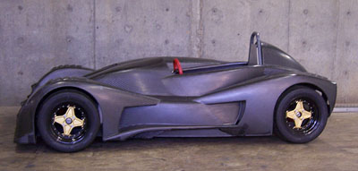 With the floor mounted, the body went on next. The fit is pretty good actually. A few things will need to be trimmed but by and large it's OK. The floor completes the styling... Now that I'm planning interchangeable bodies, the side portion of the floor should really be a part of the bodywork. Which means tweaking the molds... Doable, but not a priority right now.