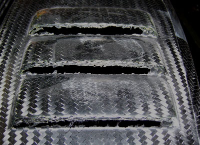 After the test-fit the body came off and I spent several hours cleaning up various details. Out of the mold there is a lot of flashing, as can be seen in the louvers below. All of it needs to be trimmed and sanded. Also I finally cut out the openings for the tail lights since I'll have to have a working brake light for the track.