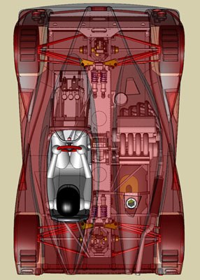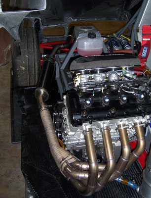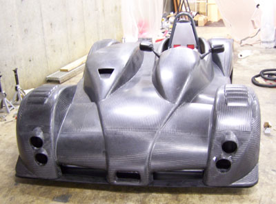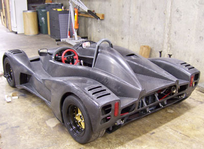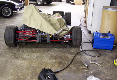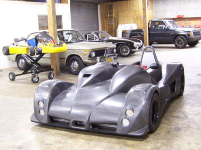 Back home at 1 am I give about 10 seconds thought to doing a site update and pass out instead, just having enough energy to set the alarm for 5 am and get all the batteries for the electronics charging. The alarm goes off in the middle of one of the more bizzarre dreams of late and it's a bit surreal to just get myself going on the project again. Throwing all the equipment and gear in a duffle bag I head back to the shop. First, the mounts. It's going slowly. The quarter-turn fasteners I chose are not working too well (brackets are too thick for them) but I can make do. Joe shows up to help at 7am and brings coffee. I continue with the mounts while he gets the tailer hooked up and ready to load. At 7:30 I move on to connecting the brake lights and ask Joe to do the final fitting on the front mounts. It's close. As an instructor I need to be at the track no later than 9:30. It's rush hour outside and the sky is cloudy but it's dry. I'm just getting ready to start getting the car loaded on the trailer when at 8:15 David calls from the track and tells me it's raining there. Suddenly, all the pressure I've been piling on myself the last few days is off. The forecast originally called for rain on Friday, then they moved to Thursday, then possibly this afternoon. Guess what, the rain is here. 20 minutes later it's pouring outside. So I tidy up just a bit, change out of the work clothes and head to the track in the MINI. See the Dark Helmet page for that story. Sunday is another trackday and the forecast is optimistic. I have a few days to make some tweaks and go over things. And get some sleep. Let's see how it goes. 10/21/06 The last couple of days saw some minor tweaks. Fiddled with brake light switch. Resolved the quarter-turn fasteners (I was using Ducati parts that were too short but I remembered that the Triumph ones I had borrowed from David to put the 748 together are slightly longer so I tried those and they work great). Fabricated fake 'headlights' out of cardboard and aluminum tape. Added a couple more floor supports. Fabricated some gurneys for the tail. Tweaked couple edges on bodywork for appearance and to eliminate a rattle. Revised fuel cell vent and added a check valve (it already had a rollover valve but the check valve prevents fumes from escaping). Added some insulation around the exhaust. Put mesh screens behind the front wheels to reduce the amount of flying rocks. Stuff like that.