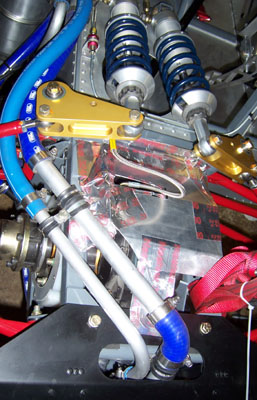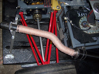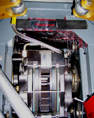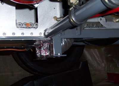 And the rest is history. Whew. Unlike a Radical, you won't need a crew for trackdays :) Now everything else falls into place like it was supposed to, even the exhaust will be easier (tailpipe can stick out farther now that body is not dropping vertically on it). Still a lot of work to be done and I definitely won't make the lunchtime track opening tomorrow but then the weather has been lousy anyway. So Monday I finish the floor and body and Tuesday I hopefully get the exhaust wrapped up. Ambitious but not impossible. Wish me luck! 10/16/06 Progress is slow. Once the floor was off I decided to do something about the brake situation, namely to try and manage the air a little better. A trip to the hardware store yielded some aluminum flexible duct and foil tape. With that, I fabricated proper ducts for the front brake. The tape was also used to seal off the bulkhead between the brake and the rest of the backbone chassis. Dust was getting inside the chassis and into everything, including the front chain. That had to be stopped and I think now it has been. We'll see what impact this has.