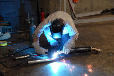 At this point it was 3 pm (time flies!) and I headed out to the welding supply shop to get the gas cylinder. Over the phone they told me that the smallest they've got is 80 cu ft and it would cost $173, filled. Not optimal but what can you do. When there, however, I was pleasantly surprised to find they actually have a much smaller cylinder for $60 and they would even refund $50 if I returned it in 30 days. Ok, deal. On the way back to the shop I dropped by the house to find the new brake pads sitting at the door. Sweet. With all the traffic and running around it's 6 pm by the time I get back to the task. Brake pads first, easy. Even the things that I thought were going to be problems (coolant pipe interference upfront) turned out to be a non-issue. So now I have new pads, let's see how they do. It took some time to configure the welder (a portable Miller MIG unit). This is because while I own a portion of it (a third? a quarter? I forget) I've only used it once and just haven't done much welding period. Had to swap wire sleeves and wire, hook up external cylinder, etc. Then I ran some practice beads on scraps I had left over. This is going to be tough. Some fiddling with the settings and then it's time to just do it. First order of business is to tack everything in place using a welding blanket to shield the rest of the car from sparks, etc. This goes easily enough. David drops by to take some pictures and generally bear witness to my endeavors. And to operate the vacuum cleaner switch. Hey, every little bit helps and I was glad for the company. The pix are cool, too.