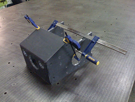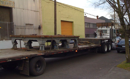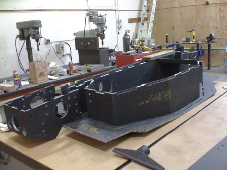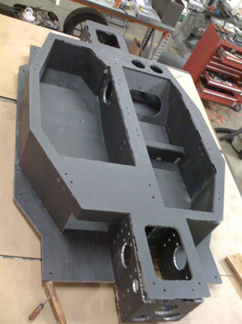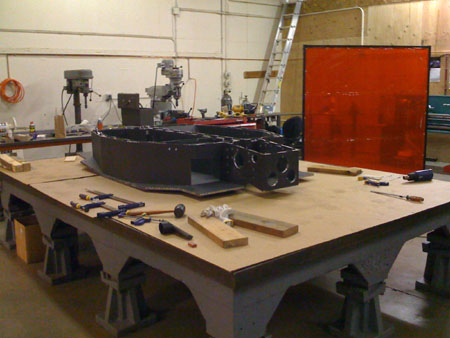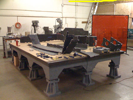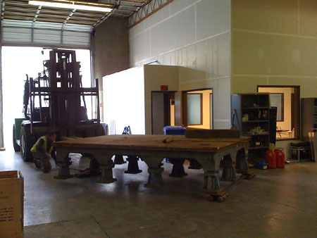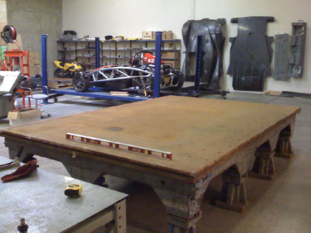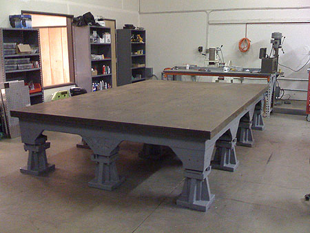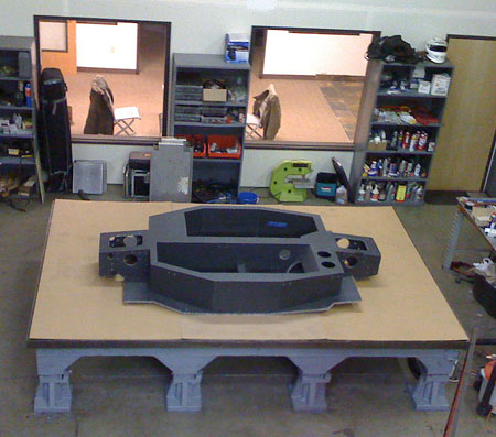 01/22/09 (updated 1/23) The trigger for the first entry in this log is the delivery of a piece of equipment - an 8'x12' cast iron layout table which will be used for building various fixtures and chassis. It's a flat and very rigid surface with tapped holes on 10" centers. The first thing to be bult on it will be the dp1 composite chassis.