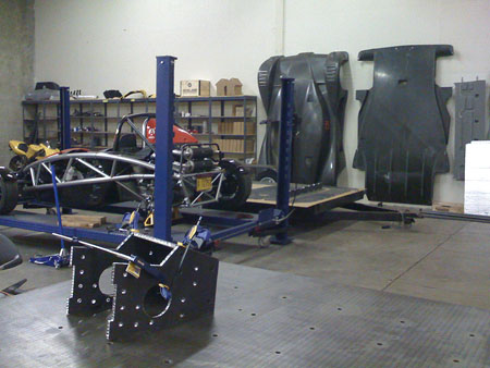 01/28/09 Some progress. Rod Trenne, of Trenne Technologies, came to Portland for a few days to help me put the chassis together. Among a number of other things Rod designed the Mosler MT900 - both styling and chassis. The dp1 chassis uses a similar architecture and construction method to that car, with a few twists of my own of course.