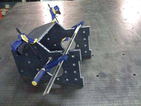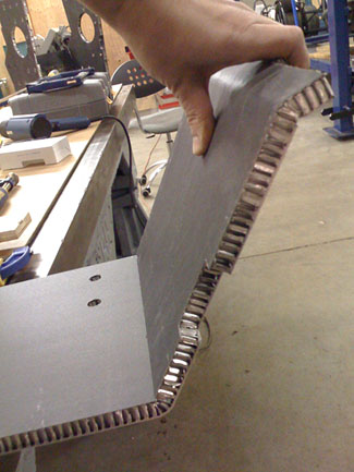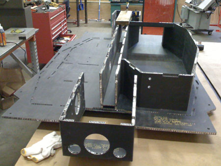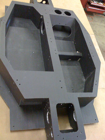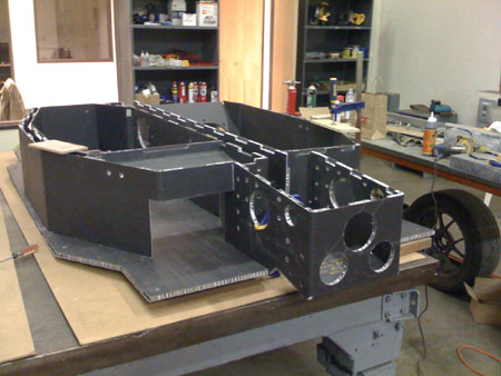 At the moment we're just bending the panels and making sure they all fit. Once the fit is verified the hardpoints will be installed, adhesive will be applied and then heat-cured in an oven that will get put together later. It's a steep learning curve. 01/29/09 The chassis is pretty much test-fit together. A couple more clearances to fine-tune but basically this is what it's looking like...