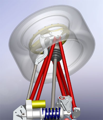 At the same time the parts are being ordered and made we're creating a part numbering system, inventory control, bills of materials, approved vendor list and the like. No shortage of work in other words. Speaking of work and progress, there's some movement on the Palatov website - www.palatov.com. It's still under construction of course but it's starting to get filled out a bit. Tristan is doing the bulk of the work on that. 02/19/09 Much work has taken place since the last update. A lot of detail engineering, simulations, getting parts quoted and yes, ordered. This is a fun process when things are actually taking concrete shape. Sometimes it's a bit frustrating of course, getting it all to fit, and everything is connected to everything else. Steering mechanism is a good example. To make room for the drivetrain and allow a more direct connection between the wheel and the rack I moved the rack ahead of the axle and upwards, in line with upper wishbone pivots. Eliminating bumpsteer requires moving the steering arm up in the wheel, which gets it close to the rim. And the tie rod interferes with the wheel when it's turned. So, a lot of close clearances and interesting looking solutions... But it all works. At least in the computer ;)