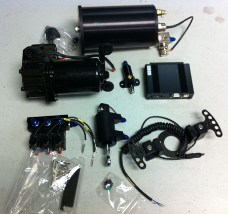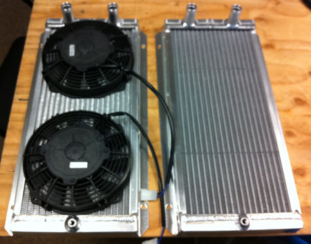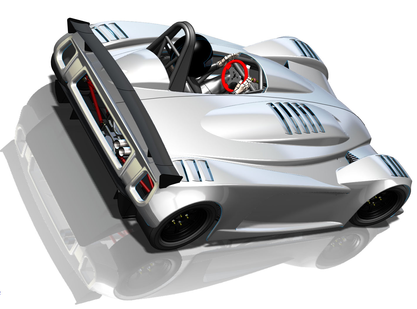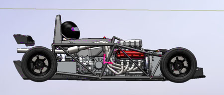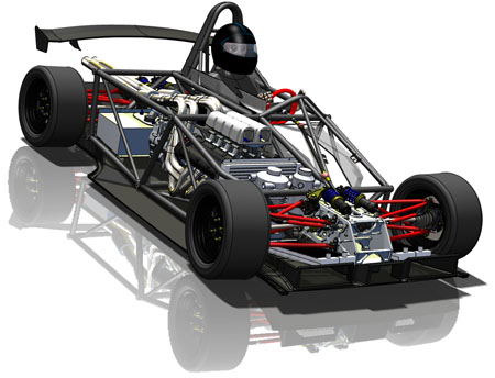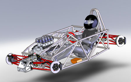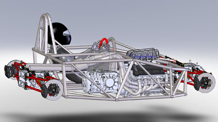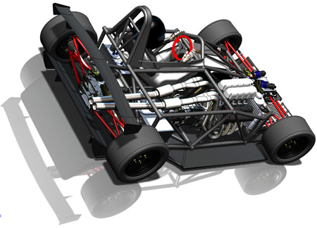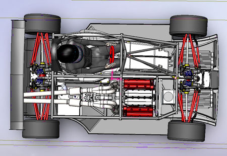 Lots of other things are on order and hopefully will be arriving soon. It's hard to picture this car drivable by the end of the month but that is our goal. EVERYTHING has to go right for that to happen. We'll see. 03/06/11 Along with real-life progress (the frame is now fully welded, for example) I'm still updating a number of details in CAD. The latest is the packaging of oil cooler, drysump tank and overflow/vent tank. Still need to do the brackets for all that and finalize engine mounts. Couldn't resist some gratuitous pix in the meantime. Click on them for larger versions. Yes, there are two fuel cells - each of 5-gallon capacity. It's double what the dp4 carries and given that the dp1 has twice the engine, overall endurance should be the same or better. Afterall, using twice the power on the average would take some doing. And yes, the oil cooler will get twin electric fans which will also move air along both sides of the engine to help get the header heat out. 03/12/11 Progress continues with dozens of different items (and dozens more to go). Geartronics paddle shifter system has arrived. The suspension boxes are here and are now off to anodize, suspension arms are off to powdercoat, torque splitter shafts are getting splines, additional parts being machined and a few more being designed. Custom radiators are on their way, halfshafts being built, frame brackets are being added, and so on...