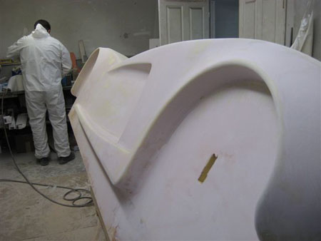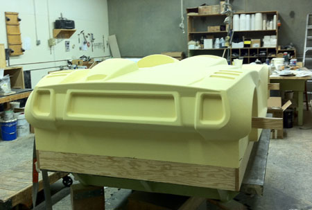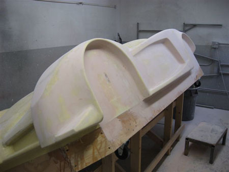 Just like it is in CAD. Yes, there'll be a lot of heat shielding and other heat management measures. We were originally going to go with Tilton 5.5" carbon clutch but after several weeks of following up today I learned that it's unavailable. Hmm.... We could get a 4.5" but that would require a new flywheel which is not an option given the timeline. Guess we'll have to go with cerametallic clutch for now. Since we'll be using an electropneumatic paddle shifter from Geartronics the clutch only gets used for moving away from a stop so it should be OK. The 7.5" cerametallic clutch I had in the Atom was a bit touchy (but manageable) so I'm hoping the 5.5" will be easier still and basically a non-issue. We'll find out soon enough. Anyway, this is just one example of an endless stream of setbacks and challeges to be overcome, every day. Seems to be the nature of the game and there's no getting away from it. I've never worked so hard for so little immediate gain, but then I've never had this much fun working either :) Totally worth it, every bit. 02/24/11 Just a quick update - the plug is now glassed and in the final stages of prep for molds.
