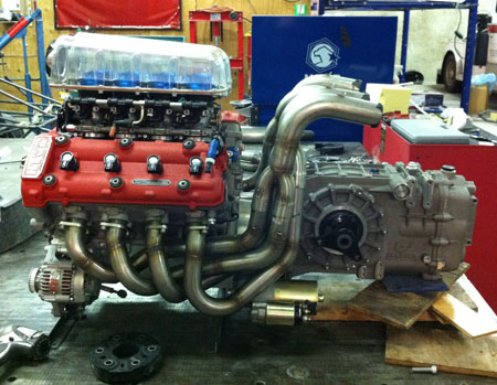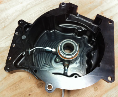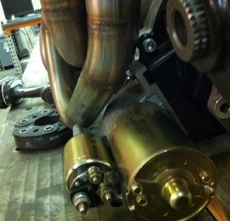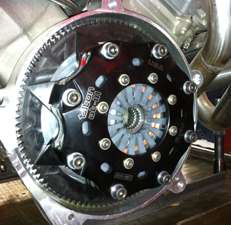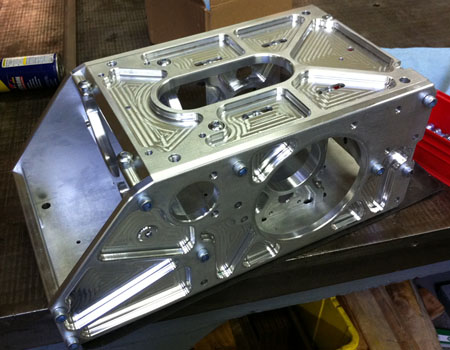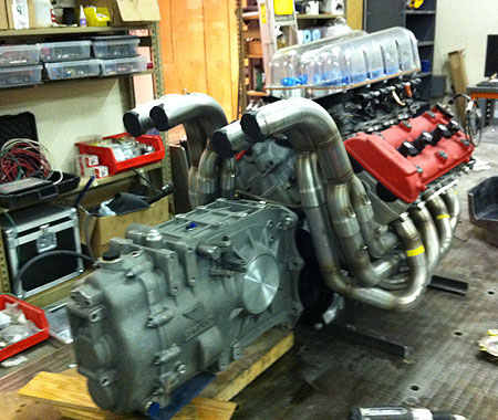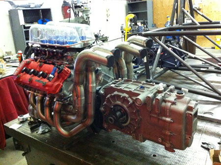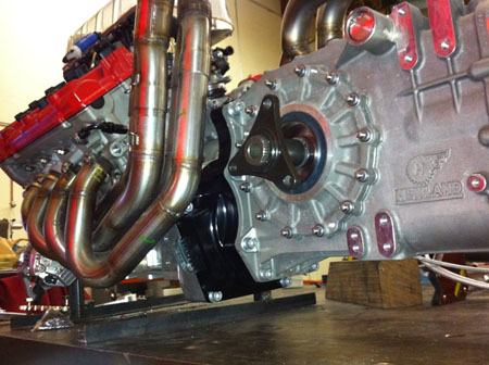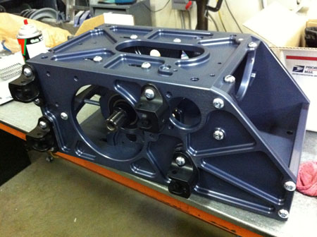 In other news, the tube chassis design is done and the order will be placed Monday for tube cutting and bending. It's going to be close but as of right now our end-of-March goal for driving the car looks achievable. We'll see. 02/22/11 We got half of the bellhousing anodized just because, now that it's back it was time to test-fit the custom Hewland gearbox to the engine. Bolts up just fine.