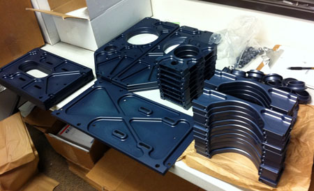 The packaging is tight as always but it all fits. Engine mounts and various brackets are now being fabricated. Other items - custom radiators and fans are here, new open-top steering wheels showed up (easier to see the dash and shift lights), the suspension box parts are back from anodize and ready to assemble.