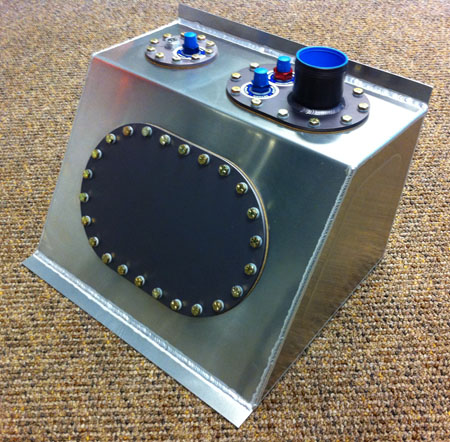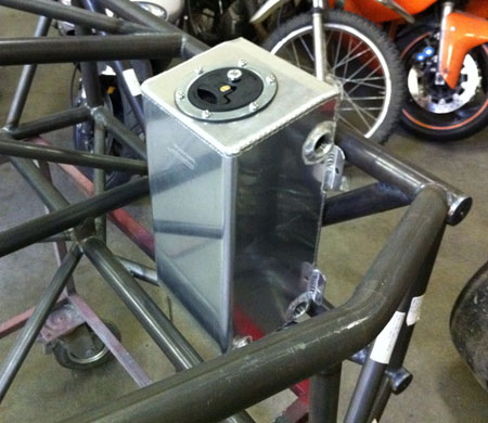Left fuel cell is here. It sits behind the driver and is 5 gallons in capacity. Full bladder, SCCA/FIA compliance and all. There will be another 5 gallon cell behind the transmission, it's on order. Initially we'll just run with this one.