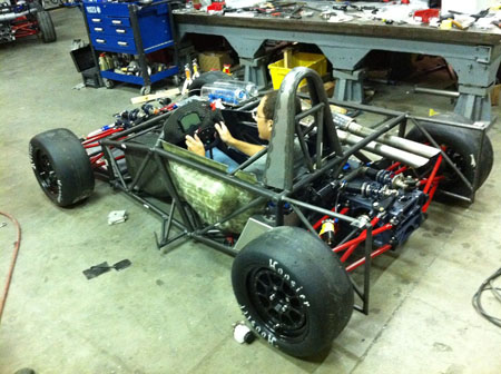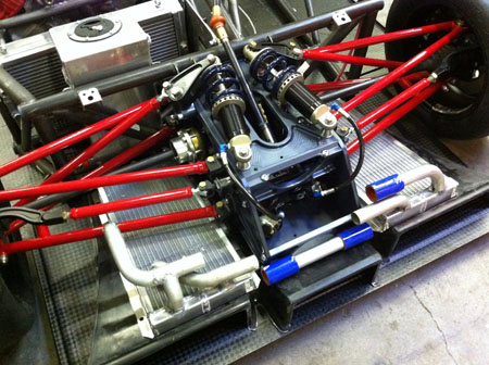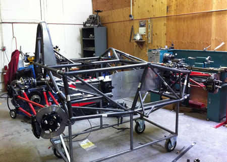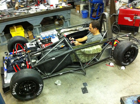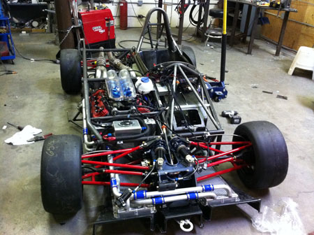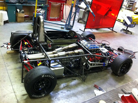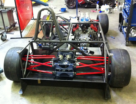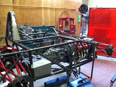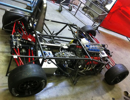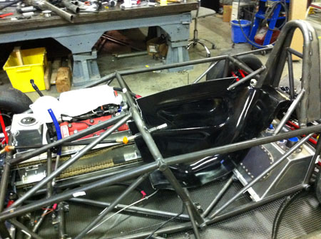 I've got a whole weekend of wiring and plumbing as well as designing brackets and mounts for all the miscellanous bits like battery, fire system and paddle shifter components ahead of me. Joy. 09/07/11 Not much in the way of updates lately but LOTS of work. I'll skip to the interesting part - the car is now on its wheels, the floor is fitted (and the body at least test fitted).