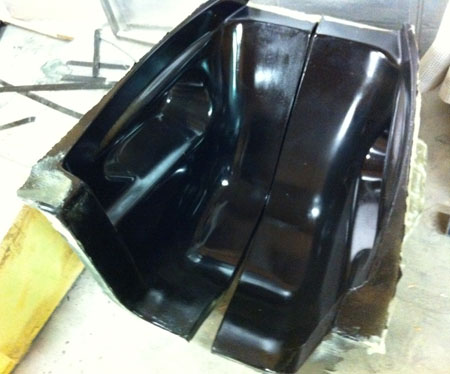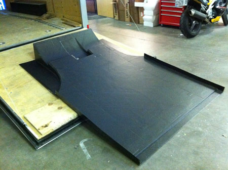 More soon. 08/26/11 We're going like crazy on this car and still doing some stuff on pretty much all the others at the same time. Fun, in a twisted kind of way :) The floor is done, it will be trimmed and mounted shortly. Haven't weighed it yet but seems about 15 lbs. It is two pieces with the nose piece being separate (not shown, it looks just like a flat panel even though it's not actually flat).