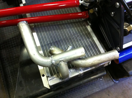 The concensus is that while we can all do it, composites is a job that's best left to people who are set up and trained for it. So in the future the plan is to do exactly that (but I still get to prep the new D4 plug because I'm testing a particular way of doing it, hopefully the last bit of composites work inhouse). In the meantime Tristan has been hard at work on the plumbing. With my customary tight clearances it's not an easy job. Yes, the radiators are in parallel - we'll see how that works, water temp will be logged. Yes, the tubes run through the suspension. There's only 3/4" total travel so we can do that. Yes, waterpump is electric. No, this complicated welded arrangement is probably not a long-term production solution but it'll work for now and we'll learn a lot from it.
