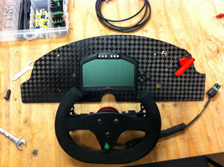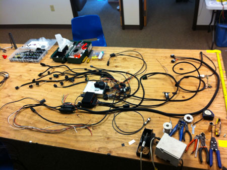 It's odd to think of a car with 80" wheelbase as 'long' but that's exactly what I think when I look at the D1. Got really used to the D4s I guess :) There's lots of less glamorous stuff too, like a wiring harness that's mostly done, nearly $2K in plumbing parts and so on. The Pilot Pod is out of the molds and turned out pretty nice (still needs to be trimmed and fitted). Somehow I don't seem to have a picture of it right now. The push is on to get the car running in the next couple of days. Wish us luck. 09/10/11 No, not done yet. Close, though. It really shouldn't have been a surprise to me but somehow my memory of what it took to get the Atom running has been altered by the fact that we can do a complete D4 engine transplant including changing exhaust, engine mounts, shifter, wiring harnesses and making plumbing tweaks in under three days. This is a far more complex beastie and wiring harness alone took a week. Wiring is a messy business, although the results are pretty tidy. Had to wire all the sensors (there's a ton of them), the ECU, the GCU, the dash and the logger (still a couple wires to run but mostly done now).