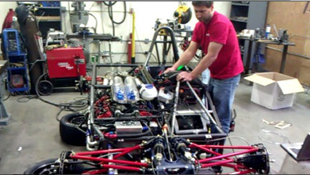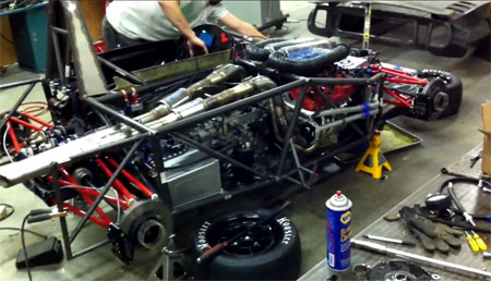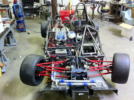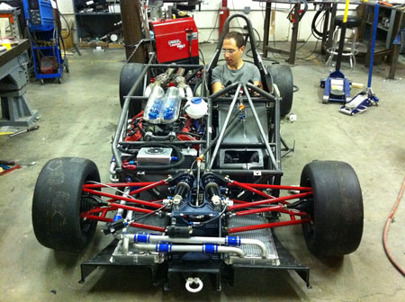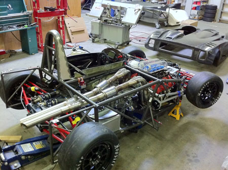 On the less visible side I'm going through the wiring and diagnosing a couple sensor issues to make sure we're ready for the paddle shifter calibration. Most likely that will happen next week. 10/12/11 Always finding more things that need taking care of. This of course is normal for the first build of a car. One example - the existing intakes rubbed on the bodywork so we turned them around, requiring the fabrication of intake runners.