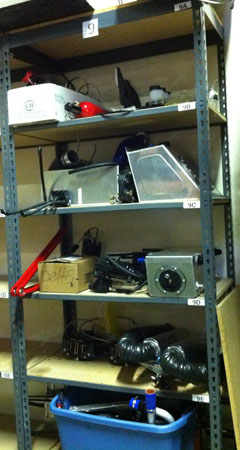 All the miscellaneous parts that will eventually get put back on have been assigned their own shelf.