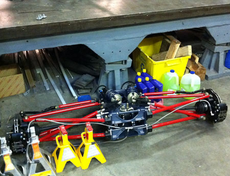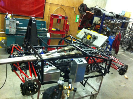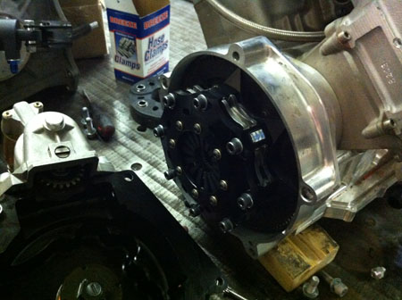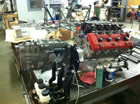 Prior to putting the engine back in we had to check and correct a small leak in the clutch slave cylinder. The pedal set was clamped to the chassis table to make testing easier. The clutch is a twin-plate Tilton racing setup but it only gets used to get going from a dead stop. The Geartronics paddle shift takes care of shifting without using the clutch at all once underway.